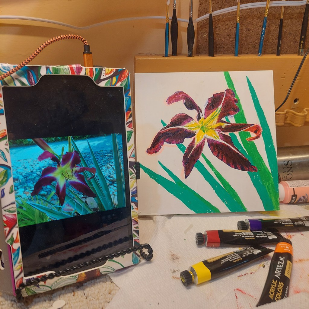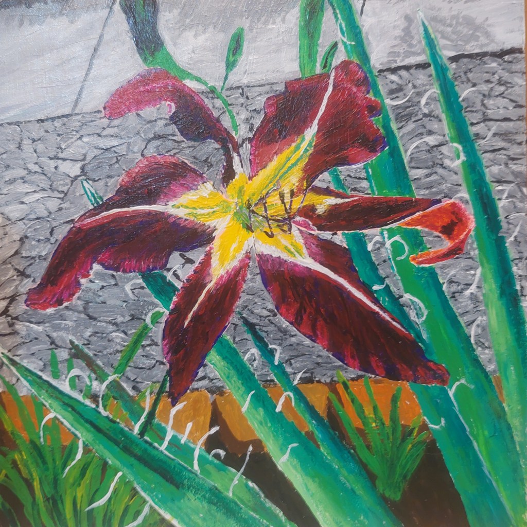 Like my other paintings, this one is based on photos from my own yard. This is an 8×8 wood panel with lively acrylic paint.