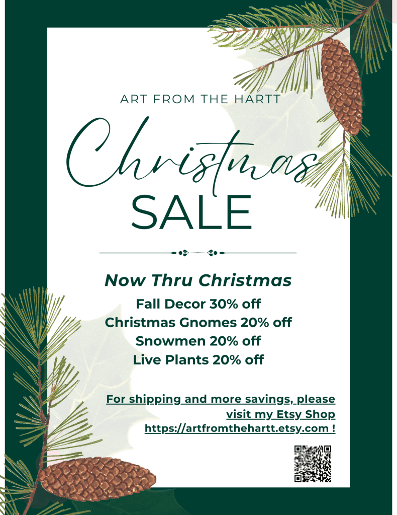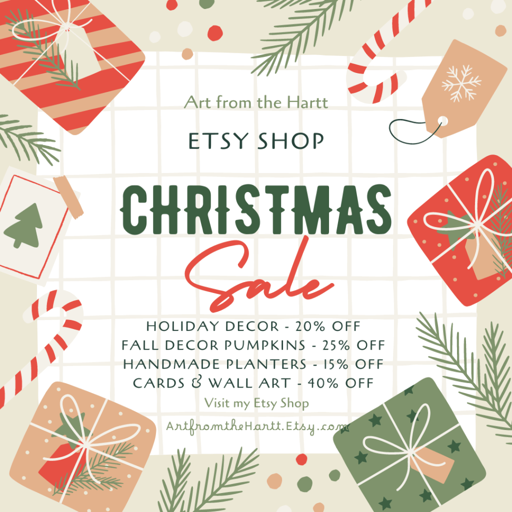 It’s beginning to look a lot like Christmas at Art from the Hartt! I have sales running at Country Flair in downtown Montrose, CO, and on my Etsy Shop! Up to 40% off. Sales items include holiday and fall decor, handmade planters, and wall art.