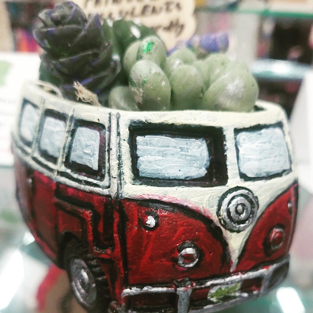 Speaking of succulent planters, those are also one of my most popular items. I have hippy busses, bug-style cars, city busses, tractors and trucks. These are available empty or prefilled with a combo of live and hand-painted cement cacti. If you need a specific color – please email me to arrange a custom order. I can do just about any color combo and I am now doing some with acrylic pour paint!