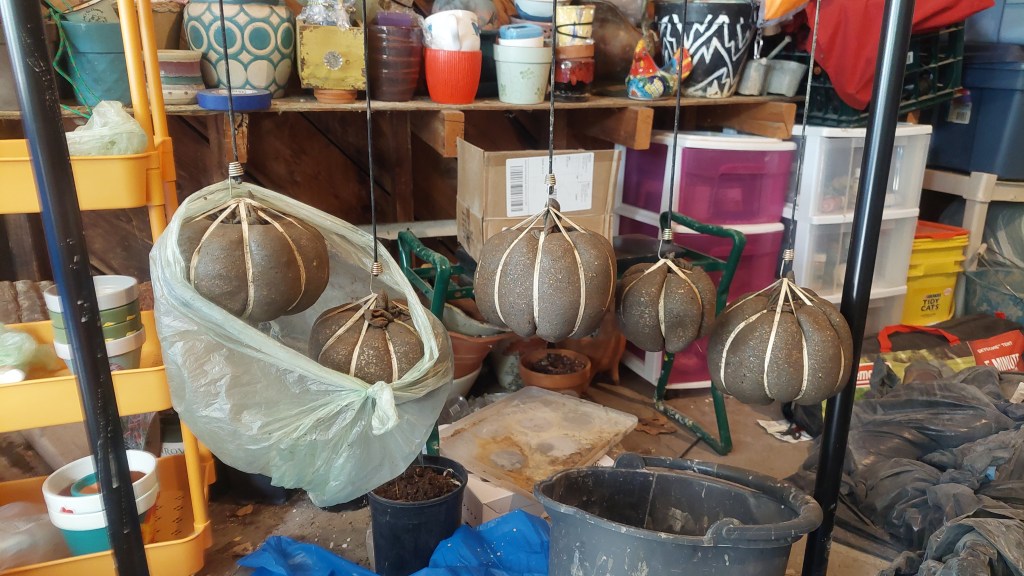 They were hung to dry. The next day, they kicked off the Leggs (well, I took the hose off), drilled, stemmed, and allowed to cure for a few weeks. The stems are fallen limbs from my own yard that have been sealed – I drill a hole in the top and secure the wood with more hypertufa.