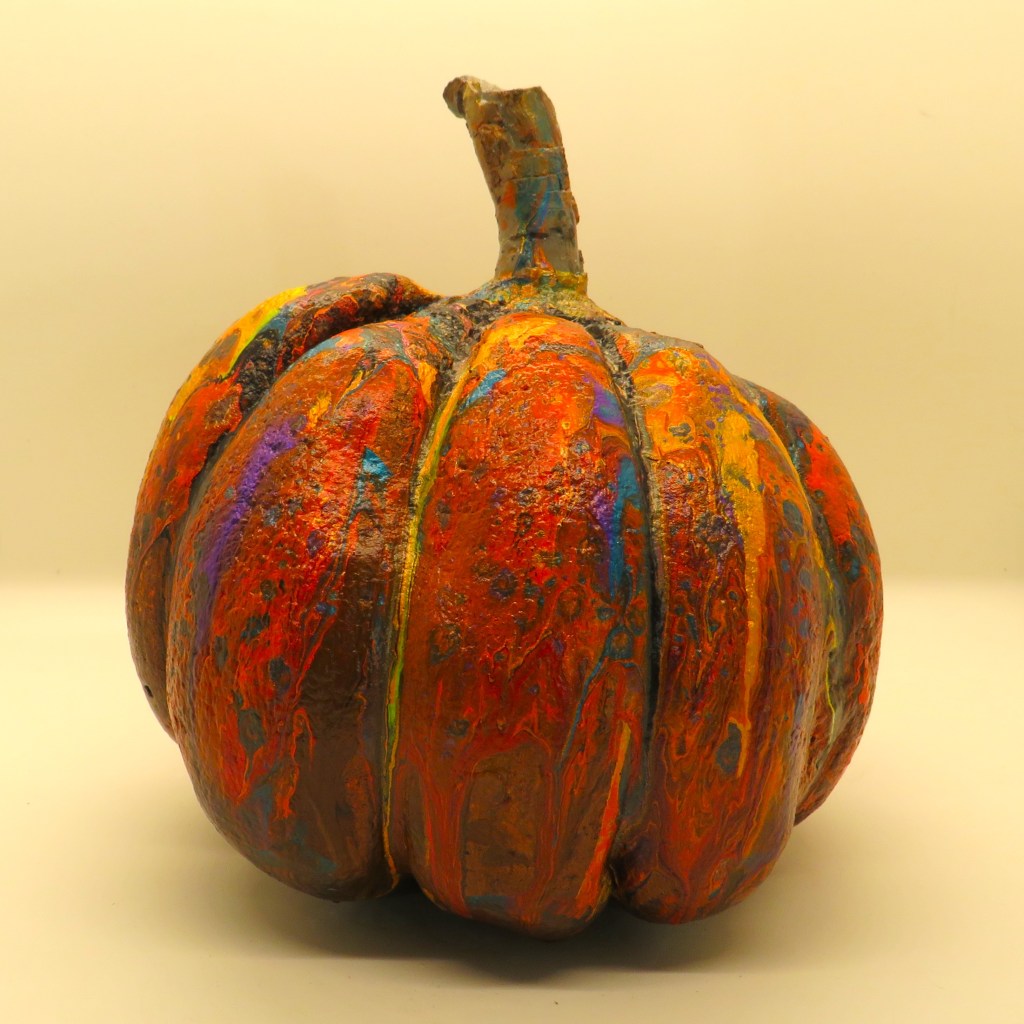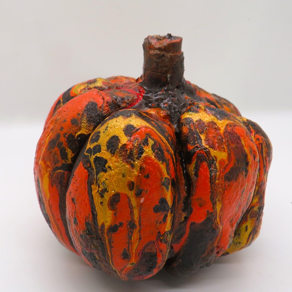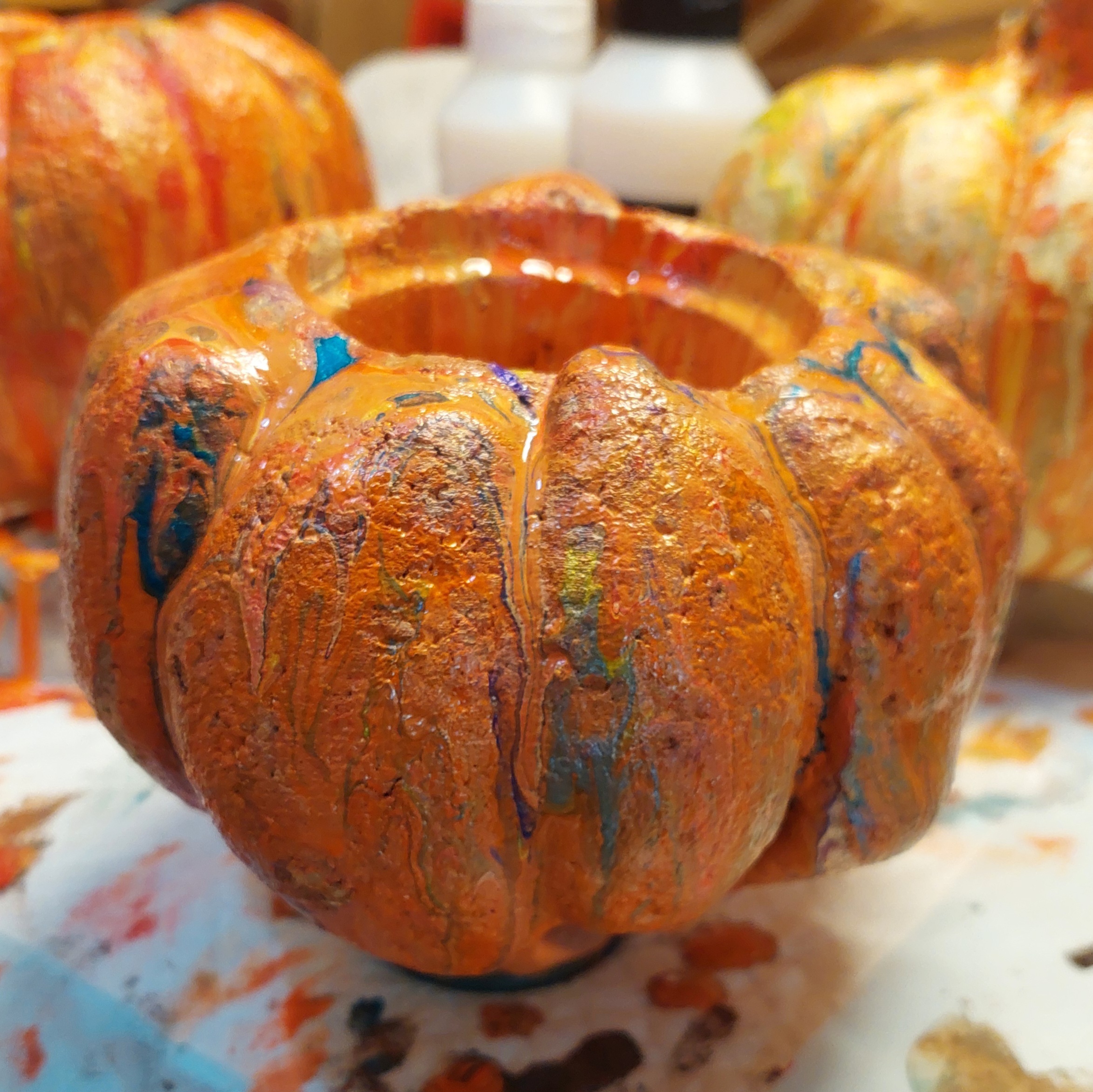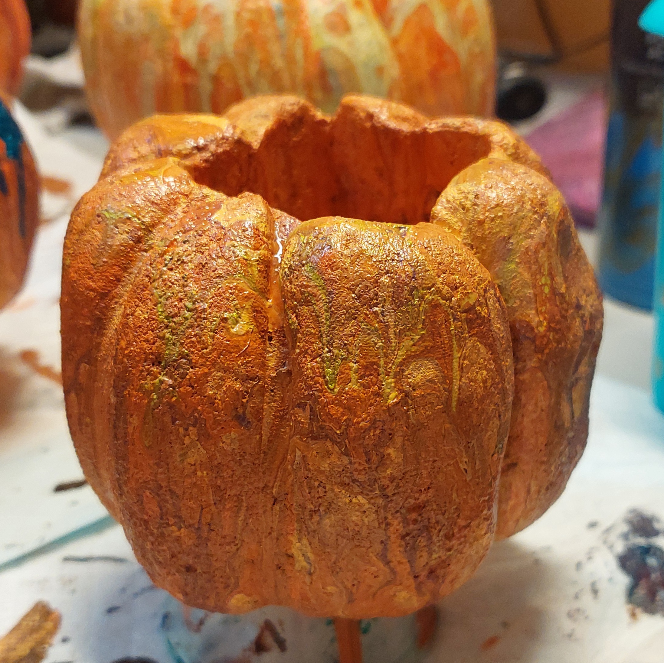 Fast forward one year – I have leftovers and love to use my fluid art skills on 3-D crafts that I handmake. So, a couple weeks ago, I rounded up the pumpkins and started pouring paint.