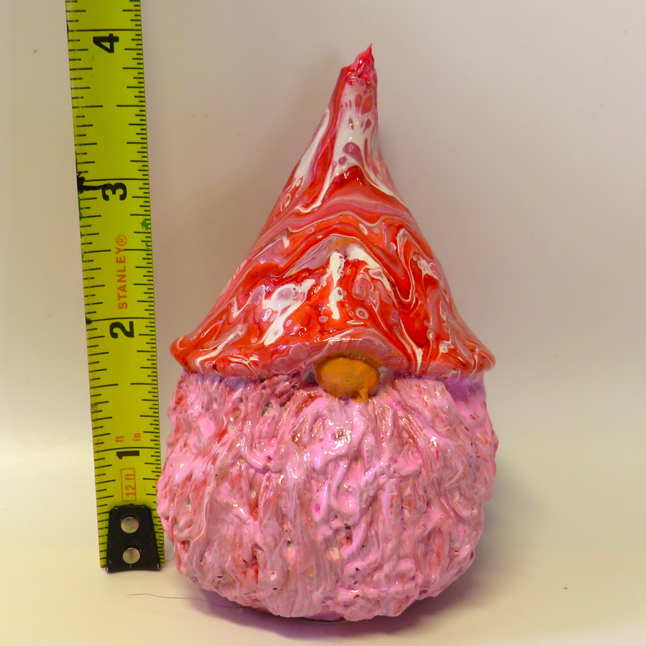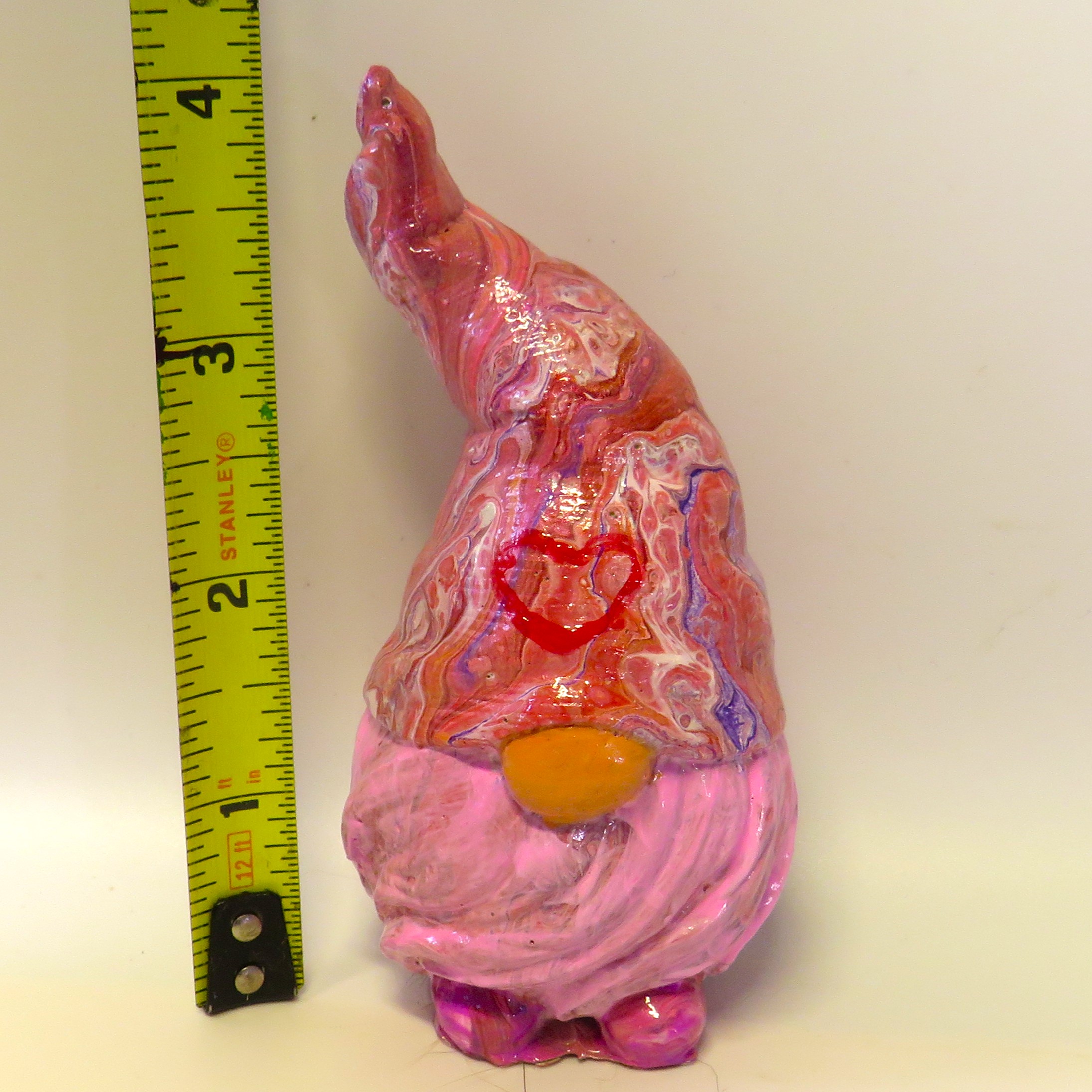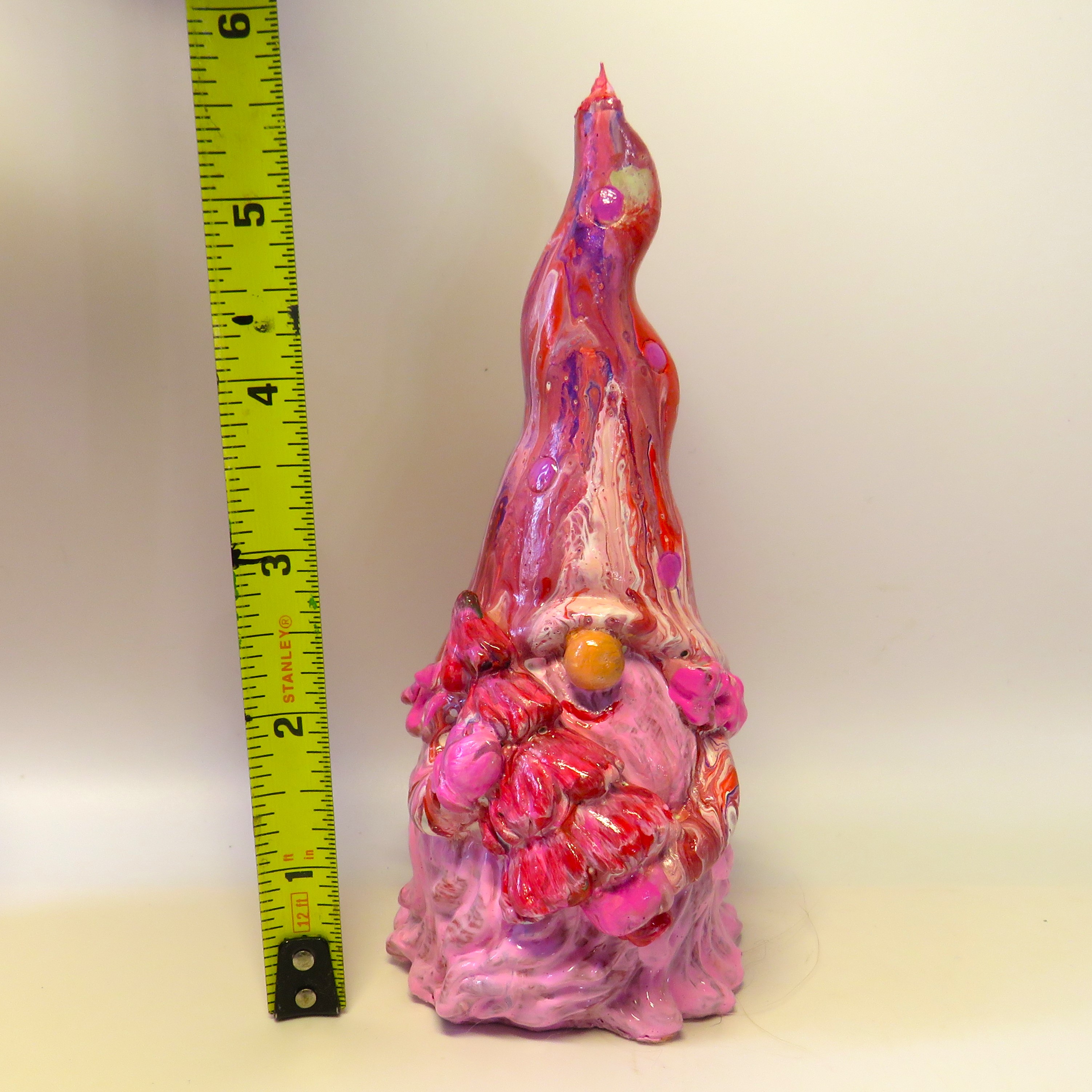 Each of my handmade gnomes start their life being cast in a mold that I import from Sweden. Once the cement cures, I paint them using acrylic pour paint. I choose vibrant Valentines colors of pink and red tones. I use a layered cup and do slightly different combos on each gnome. I add some oil to form some cells on the hats. Here is an Instagram reel of the process.