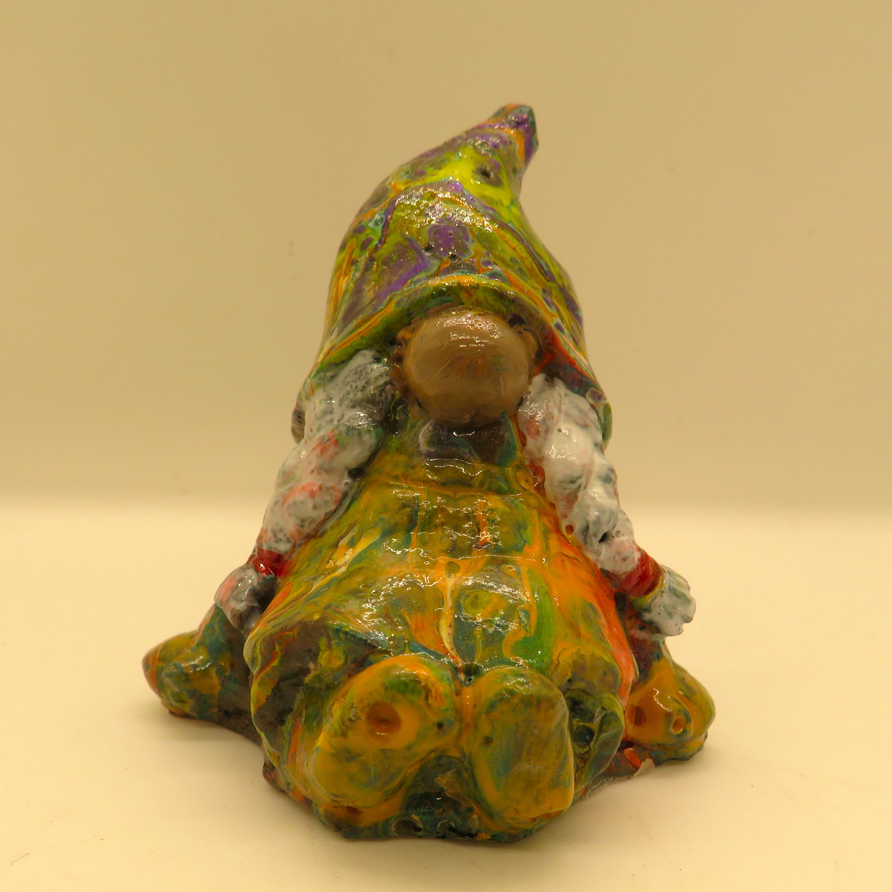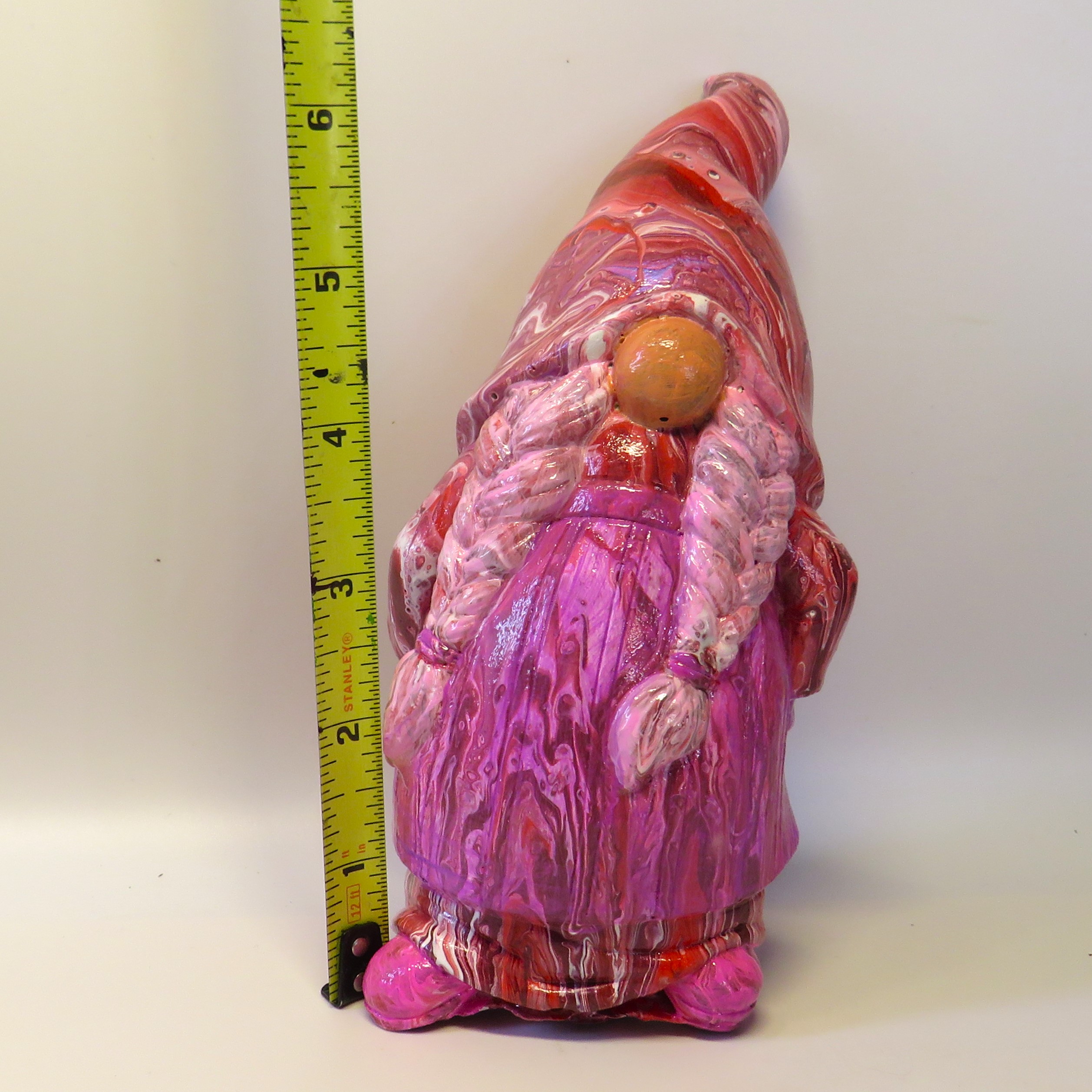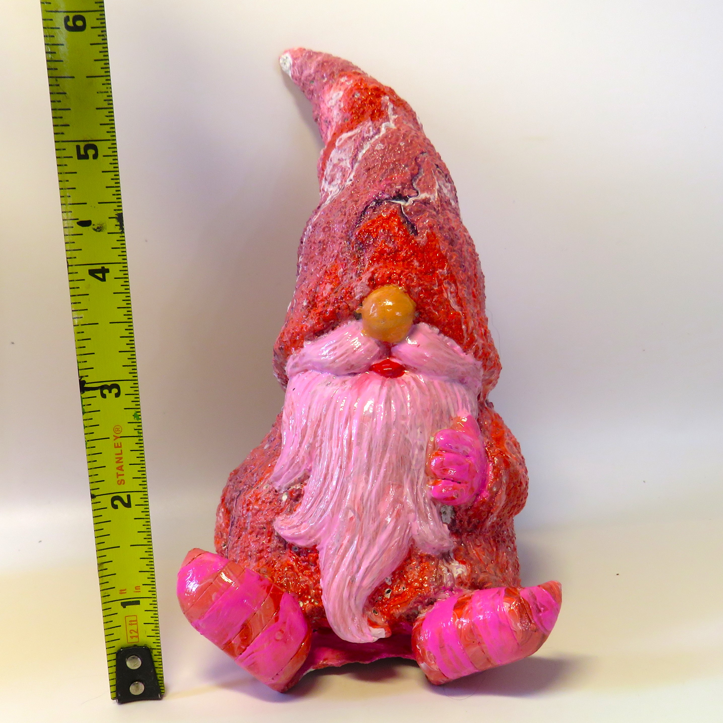 Each of my handmade gnomes start their life being cast in a mold that I import from Sweden. Once the cement cures, I paint them using acrylic pour paint. I choose vibrant Valentines colors of pink and red tones. I use a layered cup and do slightly different combos on each gnome. I add some oil to form some cells on the hats. Here is an Instagram reel of the process.