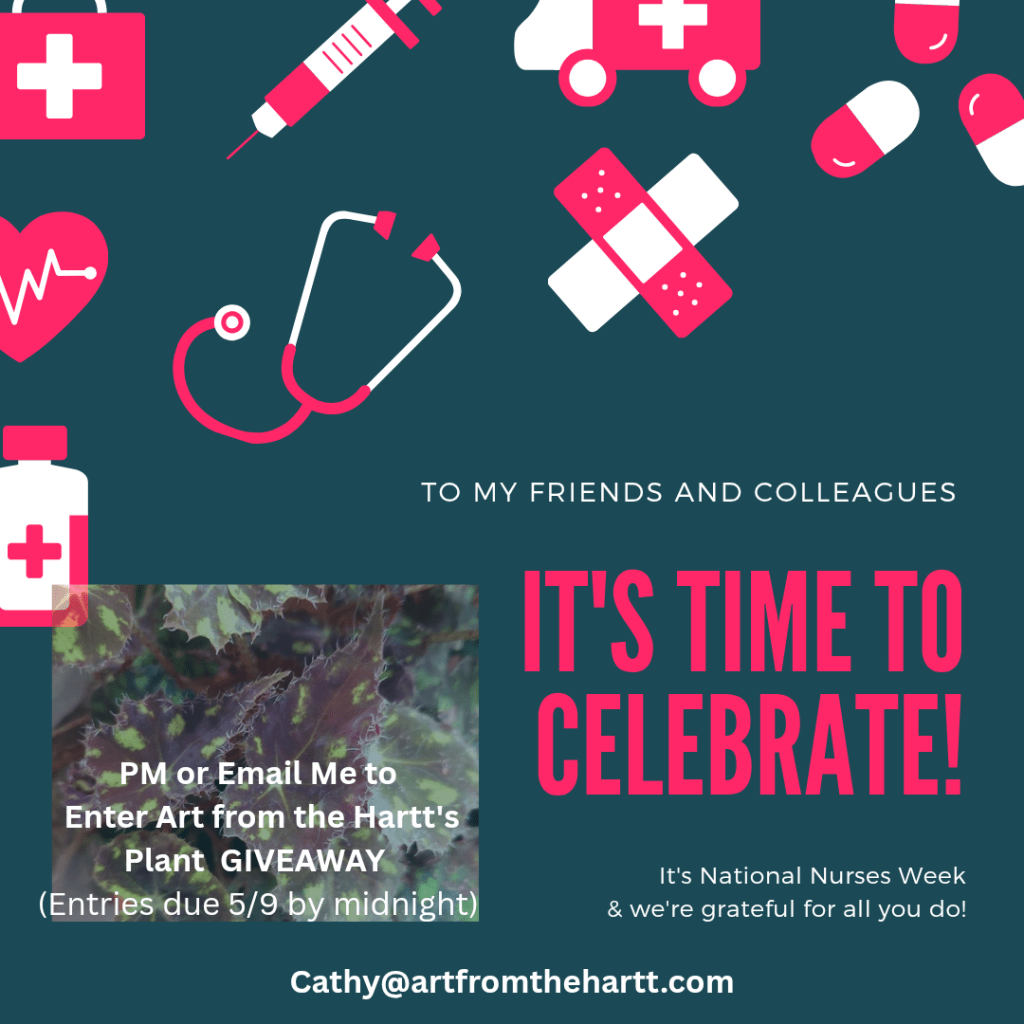 I also want to mention the plant giveaway for Nurses’ Week. If you are reading this before 5.9.25, then email me at cathy@artfromthehartt.com or PM my business page on Facebook. Put “nurse” in the heading and tell me a little about your nursing career in your entry.