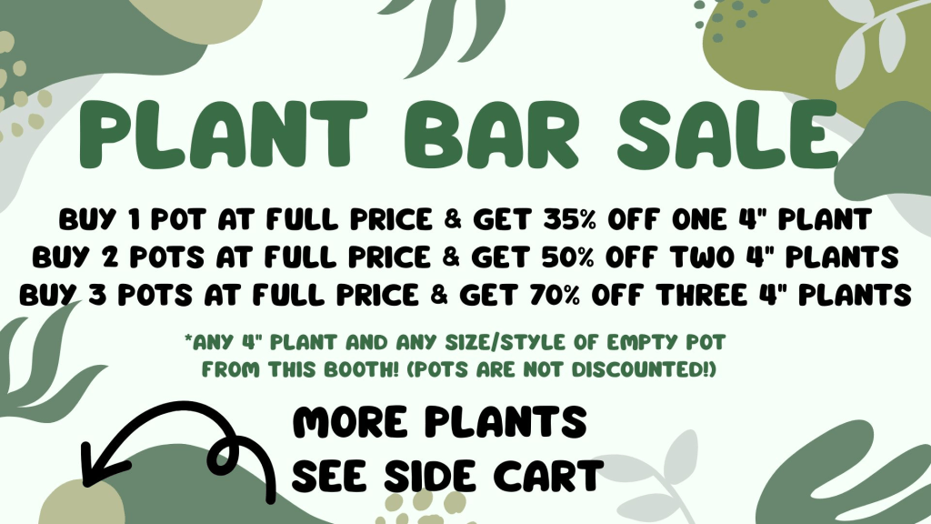I am introducing the Art from the Hartt Plant Bar. I am offering amazing sale prices on the plants you select. You can find these deals at my booth at Country Flair. Specifically, if you buy 1 pot and 1 plant, you get the plant at 35% off! And, it gets better from there. Buy 3 pots and get 70% off three plants! The planters are handmade and are full-price, so grab a plant to fill it!