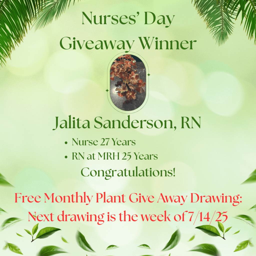 Giving to the nurses is something I feel deeply about because it is giving back to my profession. Congratulations to Jalita, Billi, and Stephanie. Enjoy your 4″ plants. Thank you for all you do for our communities!