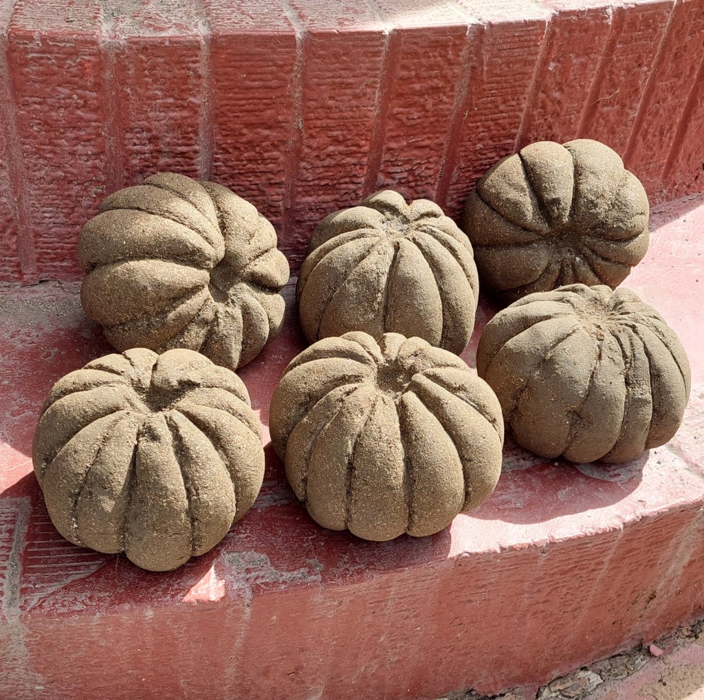 I managed to make some hypertufa pumpkins in early August before our Utah camping road trip. They cured for a month in my garage. I got them painted before I left (again) for our big camping trip of the year (to Utah). You see, I had to end the August trip early due to my Kachina having pancreatitis.