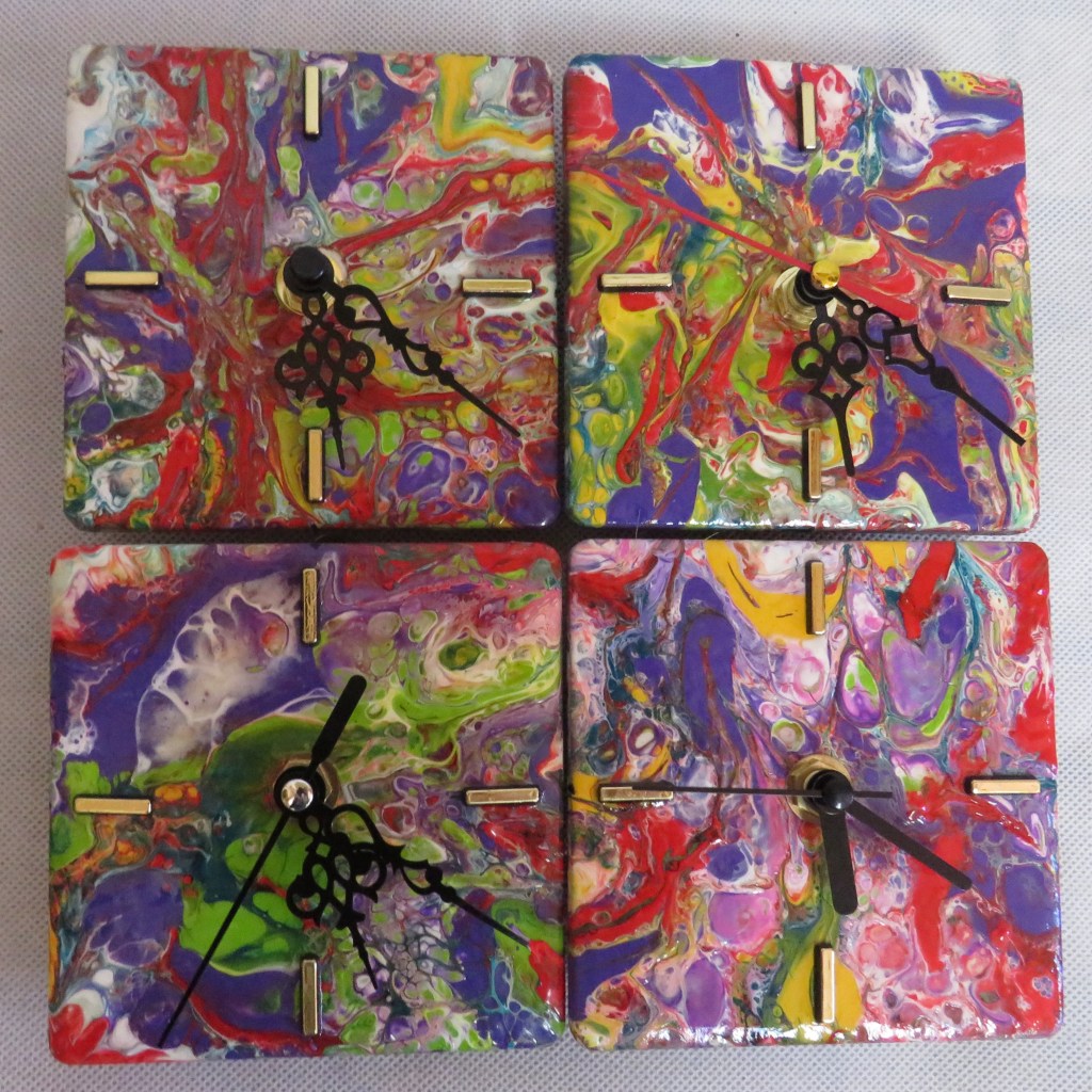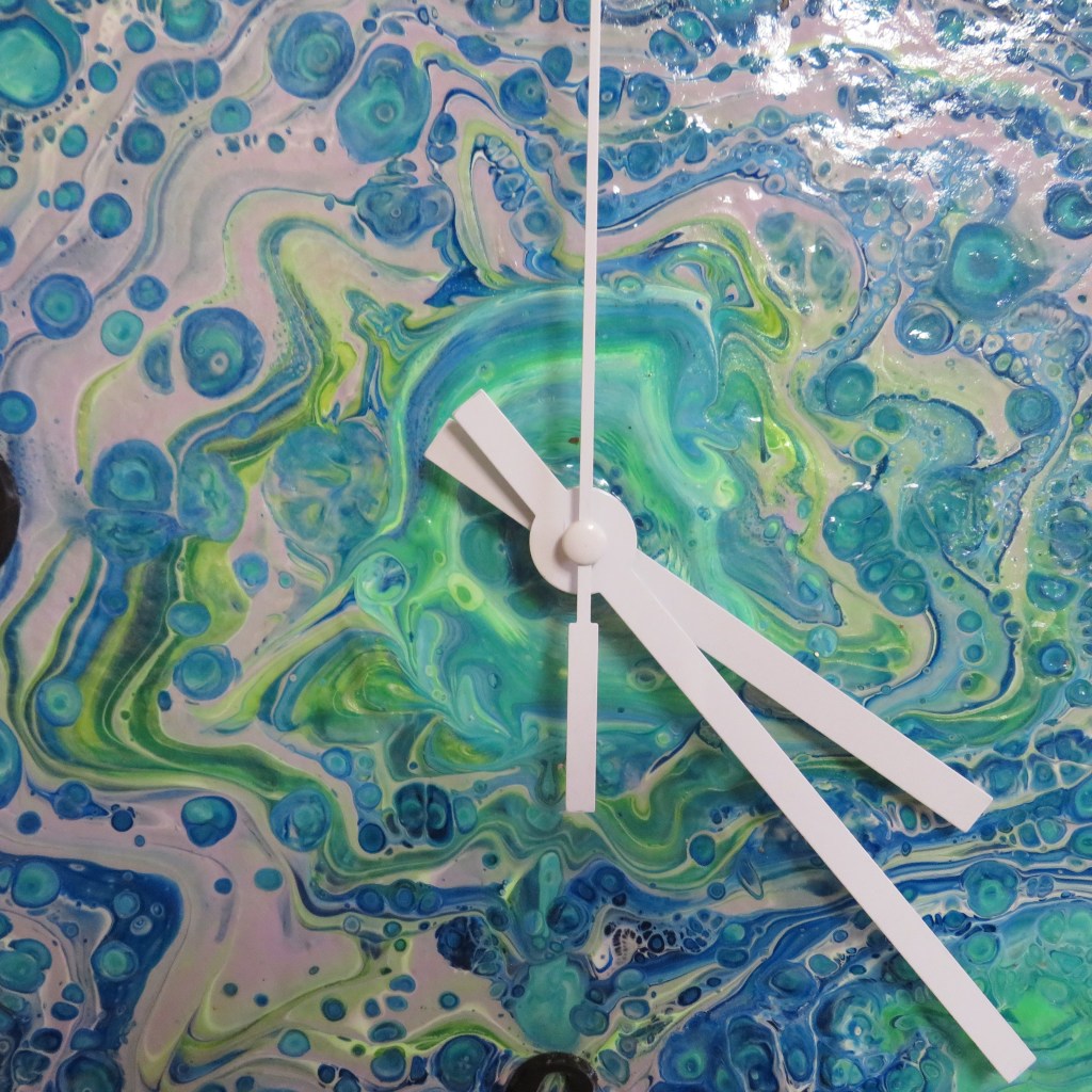 My fluid art tile clocks are made from various sizes and shapes of recycled Habitat for Humanity tile. I used a variety of acrylic pour methods, including flip cup, straight pour, cloud pour, and more. Once dry and cleaned, I seal the clock with acrylic engine enamel.
